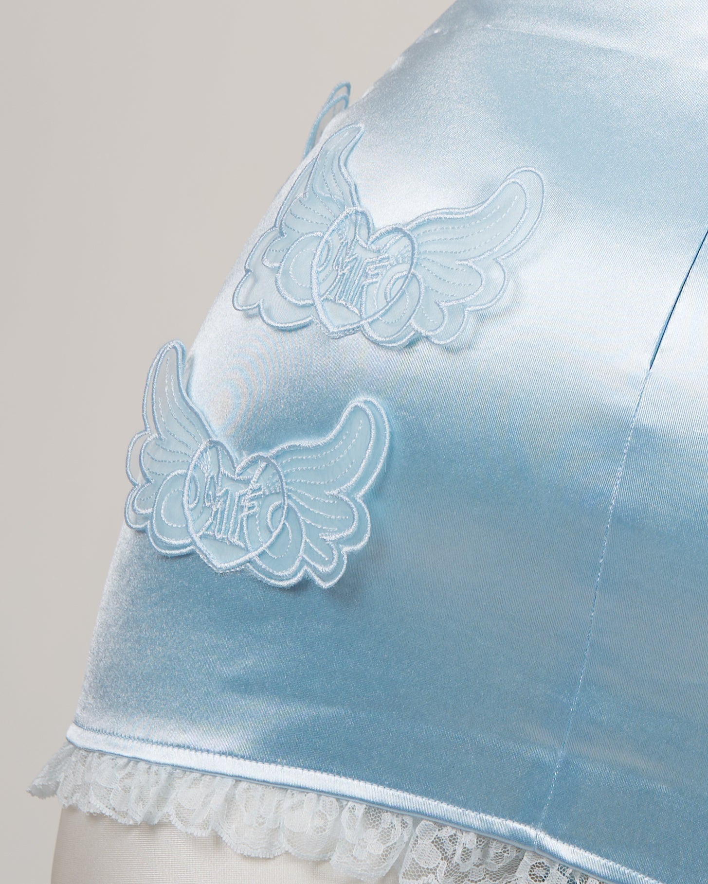 The Heavenly Dress is designed for those who want to feel both ethereal and bold. Made from luxurious stretch satin, it hugs your curves in all the right places. The intricately embroidered angel wings on the front and back of the hip offer a heavenly charm, while the rhinestone chain that cascades from the chest to the neck adds just the right amount of sparkle. The gathered lace hems and back zipper complete the look, making this dress perfect for a night out or a special occasion. Infused with anime and cosplay vibes, but designed for a more minimalist feel.